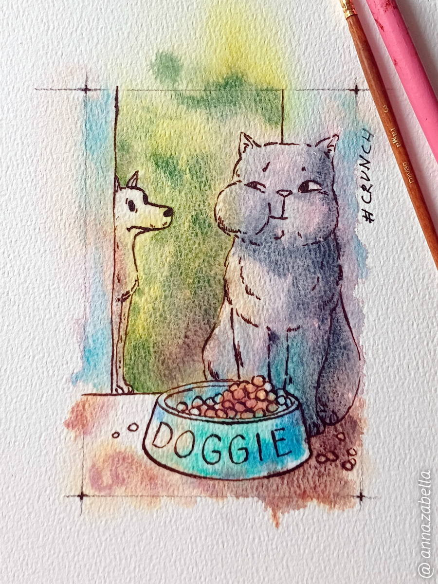 Большой довольный кот + настороженная собака на заднем плане. 2️⃣ Карандашный скетч Легко намечаю формы: — крупный силуэт кота (он главный герой) — миска на переднем плане — собака — более тонкая и вытянутая, для контраста Не давите на карандаш — это только основа. 3️⃣ Перо и коричневая тушь Koh-i-noor Обвожу самые важные линии. Не делаю всё идеально — небольшая «живая» дрожь линии добавляет характера. 4️⃣ Акварель «Белые ночи» Сначала цветовые пятна фона, потом — персонаж: мягкие переходы, немного тени, чтобы появился объем. 5️⃣ Детали Корм, надпись “DOGGIE”, крошки — именно они делают сцену «живой» и смешной. ✨ Советик дня: Если хотите, чтобы иллюстрация выглядела интереснее — играйте на контрастах: форма, размер, настроение персонажей. #annazabella_art