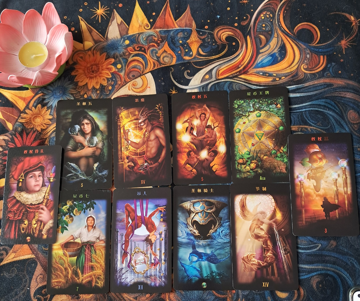 Первые три карты показывают, что этот мужчина несёт в себе непростой опыт и может проявляться через сложные энергии.