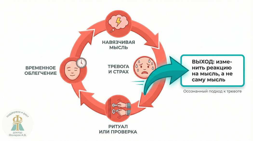 Но это ещё не всё. Навязчивая мысль пугает — и человек начинает с ней «работать»: анализировать, проверять, искать доказательства того, что она неправда. Это создаёт замкнутый круг. Мысль приходит → вызывает тревогу → человек совершает ритуал (мысленный или физический), чтобы снизить тревогу → тревога временно падает → мозг запоминает: «эта мысль опасна, нужно и дальше за ней следить» → мысль возвращается с новой силой.