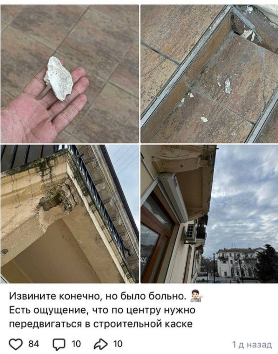 На Большой Морской, 15, у Таврической лестницы мужчину ударил камень с фасада — он выходил из магазина. По его словам, подобное здесь случается не впервые. Дома в этом районе — объекты культурного наследия, фасады и балконы давно разрушаются. За их состояние отвечают управляющие компании и собственники, деньги на ремонт собирает фонд капремонта. Сроки можно ускорить только через собрание жильцов. 💿Мы в MAX — подпишись! 🔴Подписаться на Севастополь в курсе