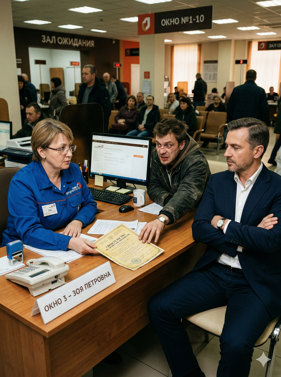 У здания МФЦ нас уже ждали. Покупатель, плотный мужчина в дорогом, но безвкусном пальто, стоял у входа, переминаясь с ноги на ногу. Рядом с ним был юрист — сухой, подтянутый, с кожаным портфелем.