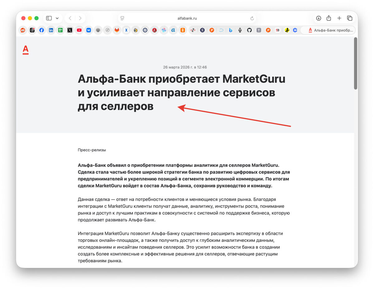 По итогам сделки MarketGuru войдет в состав Альфа-Банка, сохранив руководство и команду, а ранее Точка Банк купил похожий сервис, Mpstats, за 2 млрд рублей (так говорят). Завидую, ибо я лопух и дурень, такой рынок профукали лет 5 назад. А сейчас уже поздно пить Боржоми... @clickfraud.ru