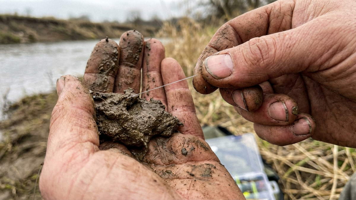 Затем я взял свой готовый, привязанный поводок за крючок. Зажал леску между большим и указательным пальцем прямо в этом комке сырой глины. И вот тут главное правило: давить со всей дури нельзя! Поводок 0.14 мм — штука деликатная. Если сдавить его жестким абразивом, он деформируется или потеряет прочность на узле. Я просто легким, почти невесомым движением протянул леску сквозь эту грязную жижу. Сделал так ровно два раза. Сполоснул поводок в реке от ошметков грязи и насадил свежего опарыша.