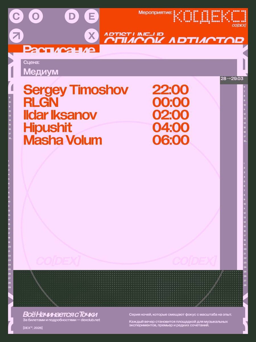 ] Cерия компактных ночей, где фокус смещается с масштаба на опыт. Танцпол «Медиум» становится площадкой для музыкальных экспериментов под руководством тех, кому доверяем. Интерактивное табло @clubdex_bot 🎫 Билеты 📆 28 марта, в 23:00 📍DEX, Москва , Шарико- подшипниковская ул., 13, стр. 32
