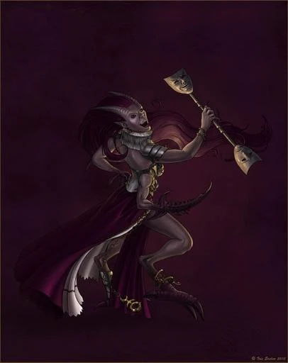 Вечная Танцовщица Слаанеш Демонесса Некогда главная прислужница Слаанеш, именно Маска укладывала сверкающие волосы Тёмного Князя и умащивала их благоухающими бальзамами. Когда настроение Слаанеш было мрачным и дабы развеять печаль своего владыки, Маска танцевала, приводя повелителя в восторг своими акробатическими представлениями. И всё же, несмотря на всю благожелательность Слаанеш, Маске было суждено стать самой презираемой из служанок Властителя Наслаждений. Во время нескончаемых ссор и войн Великой Игры, всплыла правда, что Тзинч обманом и уловками вынудил Слаанеш схлестнуться с Кхорном. Изменяющий Пути заманил Тёмного Князя целью, которой тот не мог достичь, что и привело к позорному поражению Слаанеша. Видя печаль своего хозяина, Маска решила поднять ему настроение самым забавным из известных ей танцев. Где некогда её прыжки и пируэты приносили смех и веселье, ныне наполненное горечью сердце Слаанеш узрело лишь издевку и насмешку. Каждая из идеально выверенных комбинаций движений