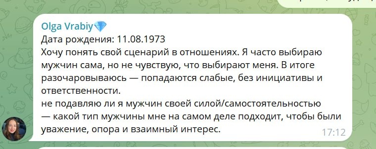е. тебе подойдет властный мужчина, но с тобой он может быть мягким, тебе как и ему нужен будет баланс. 8 всегда про власть, но в то же время про баланс, а 18 энергия на входе - про тонкий внутренний мир: тебе нравятся более чувствительные мужчины, поэтому ты и притягиваешь их, но потом путаешь это со слабостью. Парадокс твой в том, что ты реально очень сильная и волевая...не каждый такую потянет, потянет тот, кто тебя будет видеть не через призму силы, а твою суть, а это обычно мужчина с глубоким внутренним миром, а у тебя психика путает пока слабость с чувственностью. Так вот парадокс в том,что не смотря на твою силу кармический хвост про тему "жертвы" и беспомощности. И отработка психологически темы жертвы откроет тебе 3 энергию(императрицу), у которой есть все и отношения в том числе.