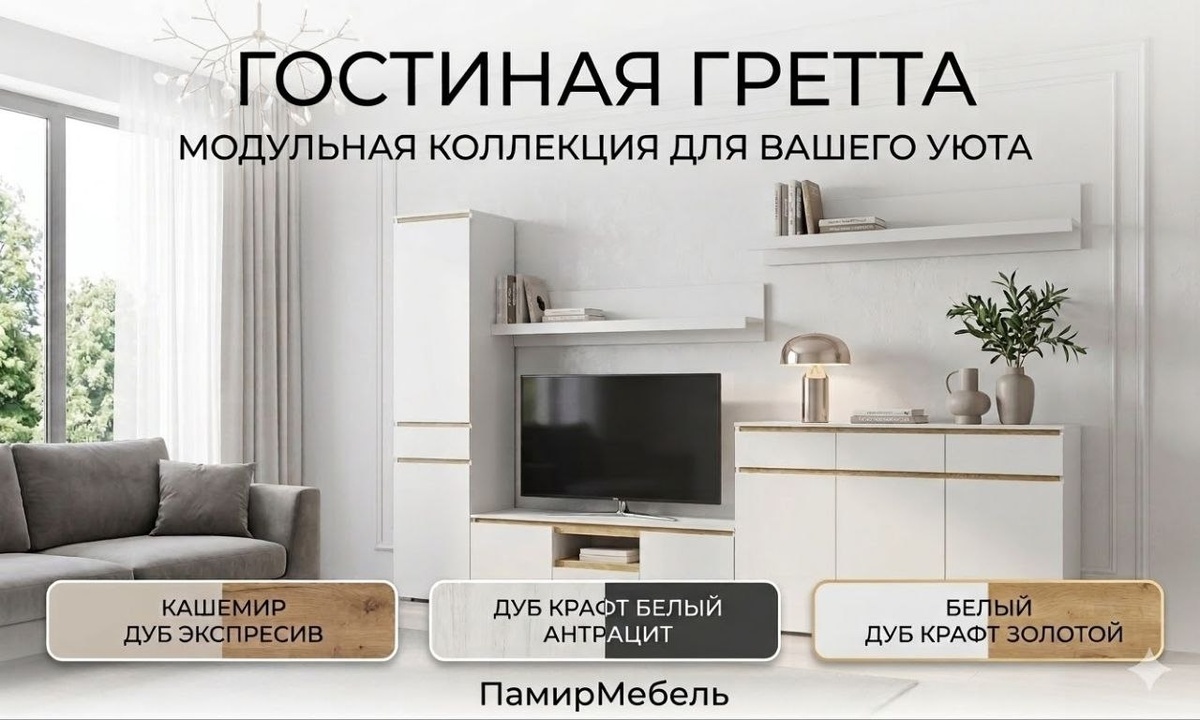 » ✨ Современная модульная система с акцентом на надежность и эстетику! Преимущества: ✅ Интегрированные ручки и фасады из MDF ✅ Обработка кромкой 1 мм и современная фурнитура ✅ Шариковые направляющие полного выдвижения ✅ Возможность установки LED-подсветки стеклополок Цветовые решения: - «Дуб Крафт белый» — «Антрацит» - «Дуб Крафт золотой» — «Белый» - «Кашемир» — «Дуб Экспрессив» 📞 Контакты: +7(949) 717‑53‑26 +7(949) 717‑53‑37 🌐 Сайт: mebelplusmariupol.ru 👉 Присоединяйтесь к каналу МАКС: Канал МАКС Создайте уют с модульной системой «Гретта»! 💖
