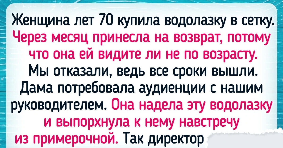 Женщина лет 70 купила водолазку в сетку. Через месяц принесла на возврат, потому что она ей видите ли не по возрасту. Мы отказали, ведь все сроки вышли. Дама потребовала аудиенции с нашим руководителем. Она надела эту водолазку и выпорхнула к нему навстречу из примерочной. Так директор чуть ли не убежал от нее со словами «вернуть ей все, только пусть оденется». © Вышивалочка. / Dzen