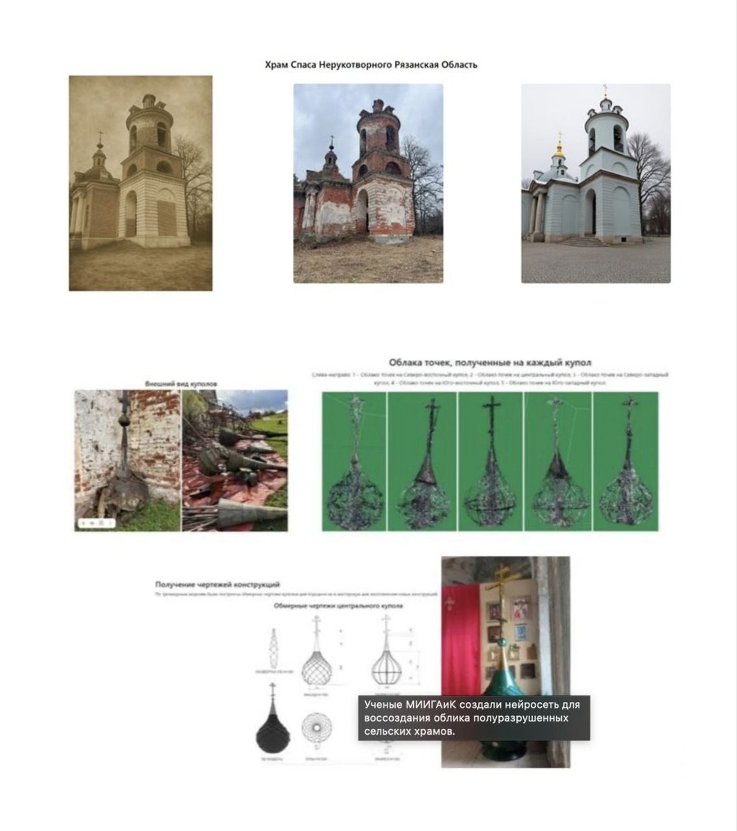 фотографии И уже получили результат: для храма Воскресения в селе Остров Ярославской области нейросеть воссоздала утраченные главки, по ним сделали чертежи, а в декабре 2025 года первый купол уже доставили на объект. Как это работает В основе технологии — связка компьютерного зрения и архитектурной фотограмметрии. Алгоритмы анализируют сохранившиеся фрагменты зданий, предсказывают геометрию и глубину сцены, а затем автоматически достраивают утраченные элементы — от куполов до деталей настенной живописи. В итоге получается реалистичная 3D-модель памятника. 🟩Нейросеть обучена на датасете из более чем 200 3D-моделей православных храмов. 🟩В планах разработчиков — научить нейросеть не только восстанавливать разрушенное, но и прогнозировать, что и где может обрушиться в действующих храмах.