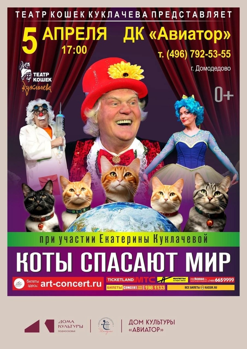 ✨ Театр кошек Юрия Куклачёва и 30 пушистых артистов приглашают вас на детский спектакль «Коты спасают мир»!✨️ Веселое шоу напомнит детям и взрослым о нужных и важных вещах, при этом удивит и порадует спецэффектами, приключениями, и конечно же, забавными и сложными трюками пушистых артистов театра!🐈 🚫 Возраст: 0+ 📆 05.04.2026🕒17:00 🏢 Городской дом культуры «Авиатор» 📍 г. Домодедово, ул.Гагарина, д.1 🎫 Купить билет: https://art-concert.intickets.ru/seance/70188225 ✅ Мероприятия Домодедово https://dzen.ru/id/66f10385cc4c5a16f7b5fb02 https://vk.ru/domodedovo_events http://dzen.ru/domodedovo_events