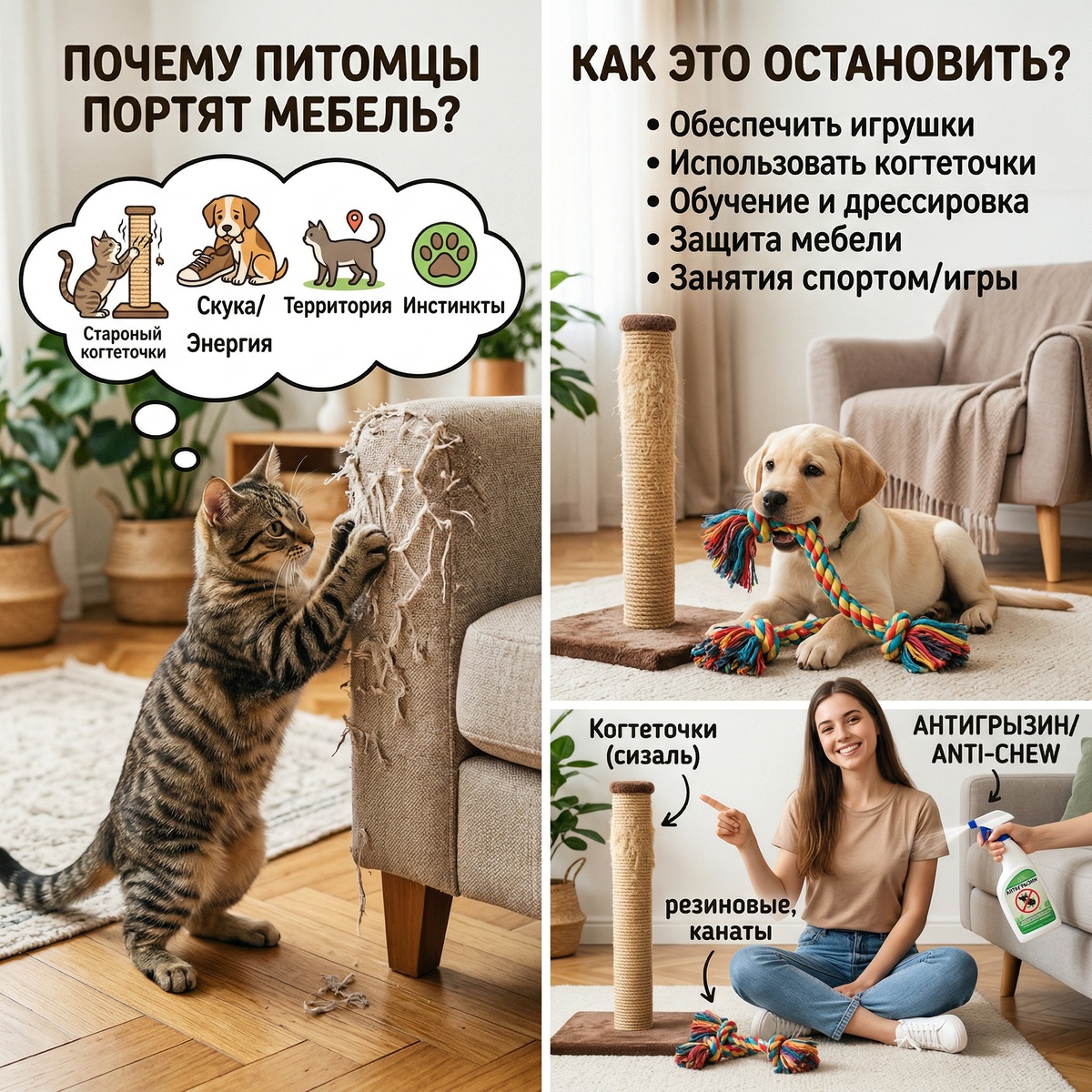 - ΠΠ»Ρ Π²Π·ΡΠΎΡΠ»ΡΡ ΡΠΎΠ±Π°ΠΊ: ΠΊΠ°Π½Π°ΡΡ, ΠΈΠ³ΡΡΡΠΊΠΈ ΠΈΠ· ΠΏΠ»ΠΎΡΠ½ΠΎΠΉ ΡΠ΅Π·ΠΈΠ½Ρ (Kong ΠΈ Π°Π½Π°Π»ΠΎΠ³ΠΈ), ΡΡΡΡΠ½ΡΠ΅ ΠΆΠΈΠ»Ρ, ΠΊΠΎΡΠΎΠ²ΡΠΈ ΡΡΠΈ, ΡΠΎΠ³Π° (ΠΏΠΎΠ΄ ΠΏΡΠΈΡΠΌΠΎΡΡΠΎΠΌ). ΠΠ°ΠΆΠ½ΠΎ: ΠΈΠ³ΡΡΡΠΊΠΈ Π΄ΠΎΠ»ΠΆΠ½Ρ Π±ΡΡΡ Π±Π΅Π·ΠΎΠΏΠ°ΡΠ½ΡΠΌΠΈ, Π½Π΅ Π³Π»ΠΎΡΠ°ΡΡΡΡ ΡΠ΅Π»ΠΈΠΊΠΎΠΌ.