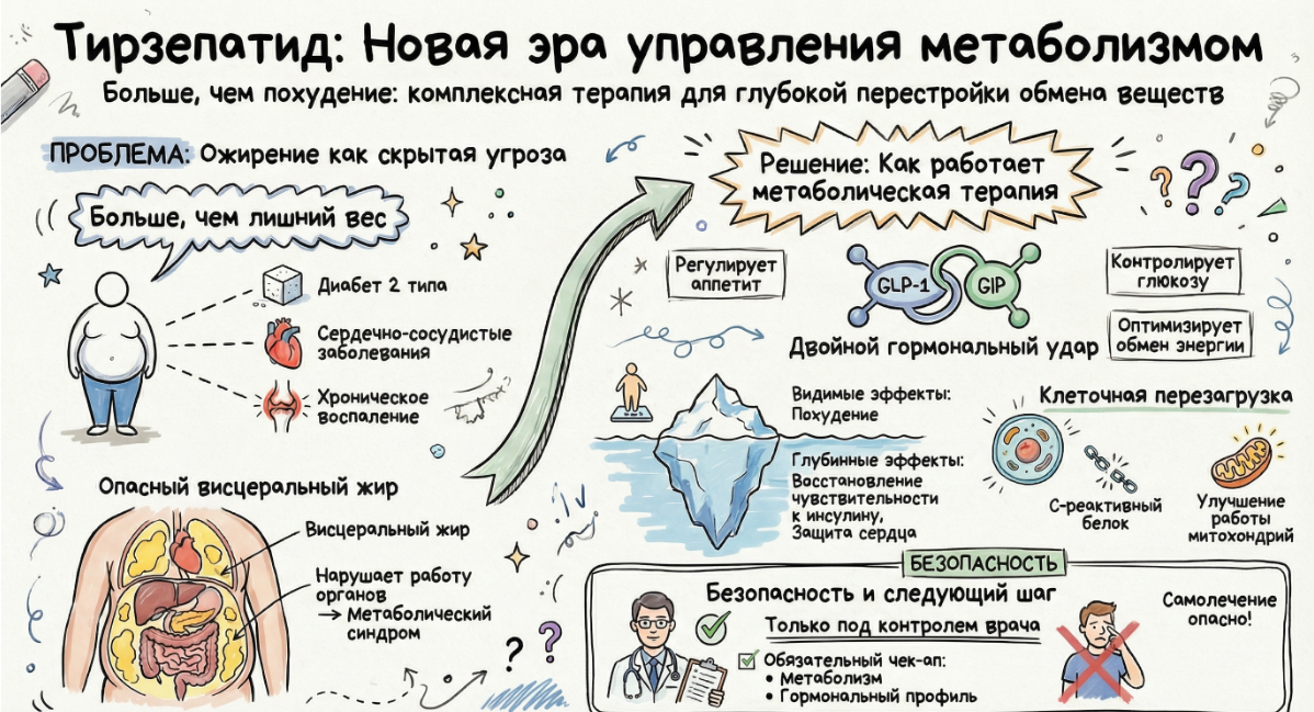 Девочки, сегодня расскажу про препарат, который сейчас обсуждают все - тирзепатид. И почему его называют не «уколом для похудения», а метаболической терапией 🔥 Когда я слышу фразы «уколола и похудела», «волшебный шприц», мне становится немного грустно. Потому что это как сказать про тестостерон: «помазалась и стала мужиком». Сводить сложную, умную терапию к примитивному эффекту - значит не понимать, как она работает на самом деле. А работает она глубже, чем просто убирает килограммы. Избыточная масса тела - это не эстетическая проблема. Это медицинская. Она связана с: 👉 диабетом 2 типа 👉 сердечно-сосудистыми заболеваниями 👉 хроническим воспалением 👉 жировым гепатозом (печень страдает) 👉 эндокринными нарушениями 👉 репродуктивными проблемами 👉 некоторыми видами рака Поэтому, когда мы говорим о похудении, мы на самом деле говорим о профилактике всего этого списка. 🔬 Почему тирзепатид - это больше, чем «укол» Тирзепатид воздействует сразу на два гормональных пути: GLP-1 и GIP. Эти