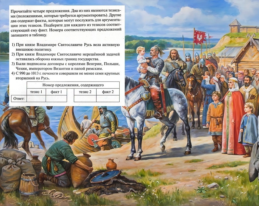 Так, так, так, что у нас сегодня? 👁️ ️Громоздкое, но не сложное задание, уверена разберем легко! Для начала давайте определимся, что такое факт? 🗿 Фактом римляне назвали что-то «сделанное» или «свершившееся». Это ТО, что УЖЕ ПРОИЗОШЛО! 👉Давайте выберем факты 💪№ 3. Были подписаны договоры с королями Венгрии , Польши и Чехии, императором Византии и Папой Римским – они УЖЕ БЫЛИ подписаны – факт 💪№ 4. С 990 по 1013 г Печенеги совершили не менее 7 крупных вторжений на Русь- 100% факт, даже с указанием дат. Рассмотрим тезисы под номерами 1 и 2. 🤔№ 1. При князе Владимире Святославиче Русь вела активную внешнюю политику. Внешняя политика -это какие-либо действия за пределами государства, в том числе торговля, обмены, культурные договоры и др. очевидно, что к данному тезису подходит факт № 3. 🤔№ 2. При князе Владимире Святославиче нерешенной задачей оставалась оборона южных границ государства. Этот тезис про набеги печенегов). А можно даже не обдумывать, а просто выбрать по остаточному