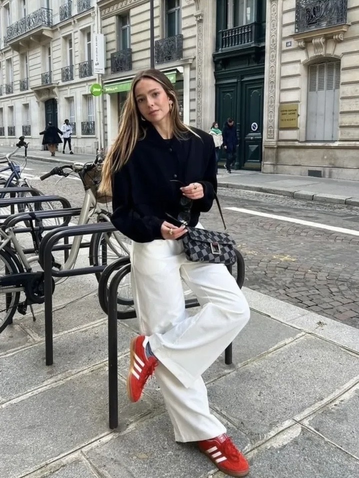 Тотальный деним. Джинсовая куртка с джинсами — классика, которая не стареет. Особенно эффектно, если добавить яркий акцент, например, красную сумку. Деним остается главным материалом сезона, и его носят тотально, создавая образы, которые выглядят одновременно расслабленно и продуманно.