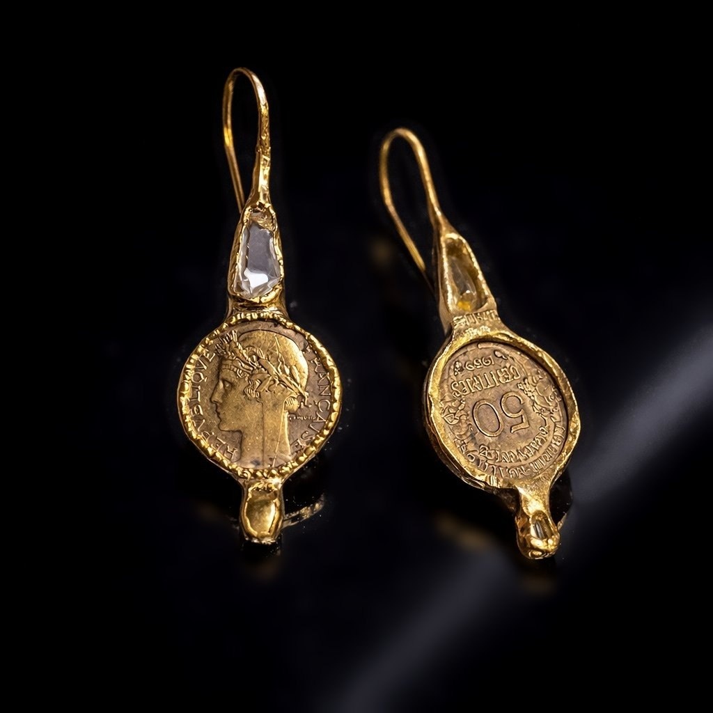 Москва 2025 серебро 1.8*5.7 Серьги «Пантикапей» - это винтажные монеты и лимонные цитрины в позолоченном серебре. Они как волшебный маршрут: от античных берегов до наших дней, от прежнего Пантикапея до нынешней Керчи. Работа из коллекции «Координаты», где каждый предмет — про место, которое хочется не забыть. Серебро, позолота, монеты, цитрины. 2025 год [Клуб Успешных Художников: VerbArt Top 100]