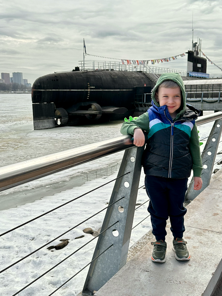 Мы с Тимохой в последнее время зачастили по музеям. Ну а что — погода хорошая, а на детской площадке лично мне уже надоело гулять. Хочется какого-то разнообразия. И вот в прошлые выходные мы поехали… на подводную лодку. Вообще, про это место я узнала в беременность. Когда уже ушла в декрет, поехала смотреть обновлённый Северный речной вокзал и с другого берега увидела подводную лодку и самолёт. Погуглила — оказалось, это Музей истории Военно-морского флота. И вот спустя время мы наконец-то туда добрались. Находится музей в парке Северное Тушино, прямо на берегу Химкинского водохранилища. Мы поехали на машине — так около 30 минут, а своим ходом с пересадками почти полтора часа. Вдоль парка есть парковка — 80 ₽ в час, а по воскресеньям бесплатно. Мы нашли место вообще без проблем почти у входа. Сам музей — это не одно здание. Там несколько частей: подводная лодка Б-396 «Новосибирский Комсомолец», основной павильон с выставкой и открытая площадка с техникой. С апреля по октябрь можно подн