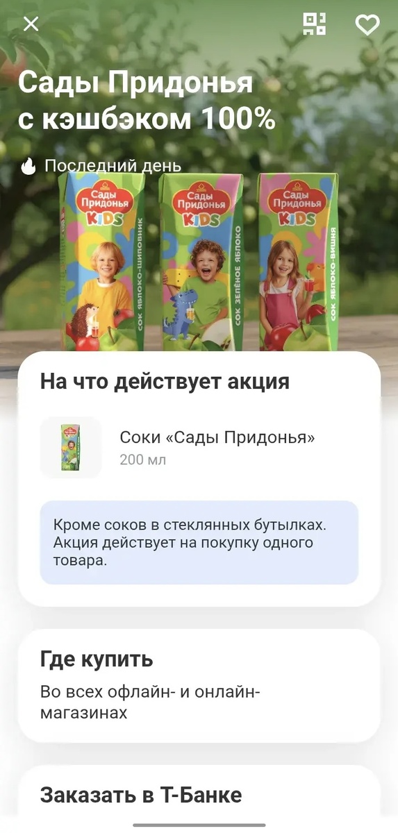 Всем привет! Т-банк очухался после вчерашнего и предложил сегодня всем 100% кешбек на маленькие соки Сады Придонья. Эти соки все время у них участвуют в акциях с кешбеком 50%, когда надо 5 дней без подряд без пропусков заходить в кешбек дня и на 5й день появляется какой-нибудь кеш. Кстати, вы не забываете заходить? Там бывают обычно из интересного эти соки, йогурты Epica, горошек Heinz, шоколад Babyfox, а кроме этого попадается кешбек 15% на Отелло, Подружку. В общем, заглядывайте туда! Так вот, сегодня на эти соки кешбек 100%. По сумме, конечно, предложение не ахти. Даже без акции эти соки у нас в пятерочке стоят 26 рублей. Сильно банк не обеднеет сегодня :) Максимальный кешбек 50 рублей, но я так дорого не видела нигде этот сок, сумму дали с запасом. Предложение, как я выше написала - у всех, я взяла на все аккаунты, конечно же. Самый простой яблочный сок, дети его точно пьют. Но можно взять и другие вкусы - яблочно-виноградный, яблоко и черноплодка и т.д. Еще хотела вам рассказать