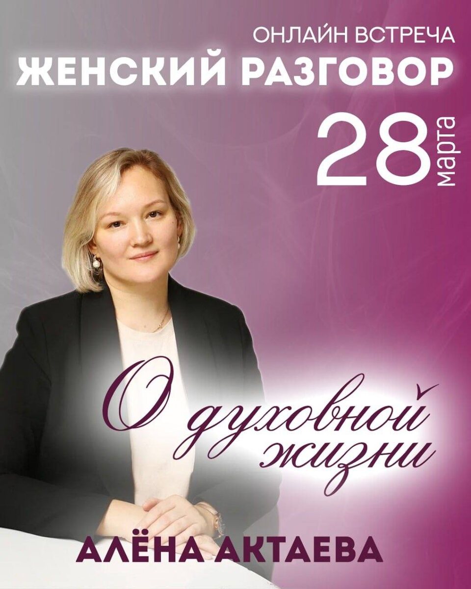 🙂🙂🙂🙂🙂🙂🙂 🚥🚥🚥🚥🚥🚥🚥 1️⃣7️⃣➗0️⃣0️⃣🙂🙂🙂 Открытая онлайн встреча с Алёной Актаевой ЖЕНСКИЙ РАЗГОВОР 🕊О духовной жизни! 🚦Учителя говорят, человек не предназначен для тяжелого труда. Тогда почему мы выбираем зарабатывать деньги и отказываемся от духовности? 🔴Духовная практика - религия или научный процесс? 🔴Как можно решить материальные проблемы духовным путем? 🔴Смогу ли я обрести внутреннее умиротворение вне зависимости от обстоятельств? И всё это Алёна Актаева будет передавать сквозь мудрость Священных Писаний! 💥ПЕРЕМЕНЫ ПРИХОДЯТ ИЗНУТРИ, ПРИХОДИТЕ НА ВСТРЕЧУ И ПОЛУЧИТЕ ОТВЕТЫ О ДУХОВНОЙ ЖИЗНИ! Подключиться к конференции Zoom https://us06web.zoom.us/j/83126063018?pwd=vQaGgZpUlyFxGiBD3RIjHz23KnE3G1.1 Идентификатор конференции: 831 2606 3018 Код доступа: 929488 🔥 До скорой встречи! Приходите и зовите подруг!