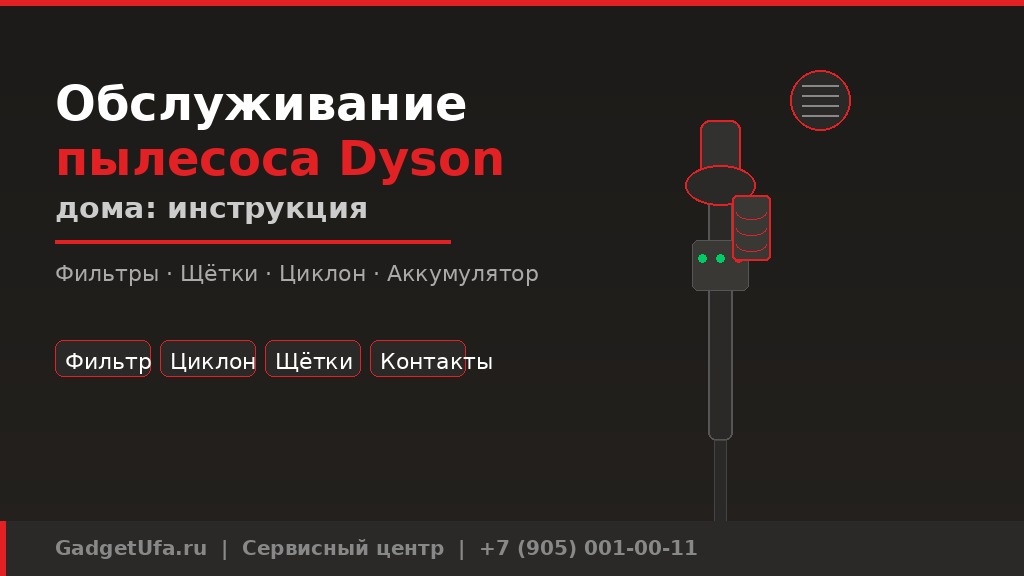 Ремонт Dyson в Уфе — от 2000 руб., замена аккумулятора от 4 500 руб., гарантия от 1 месяца. Бесплатная диагностика. Мастера GadgetUfa ремонтируют все модели V-серии, Supersonic, Airwrap и роботов Dyson 360.