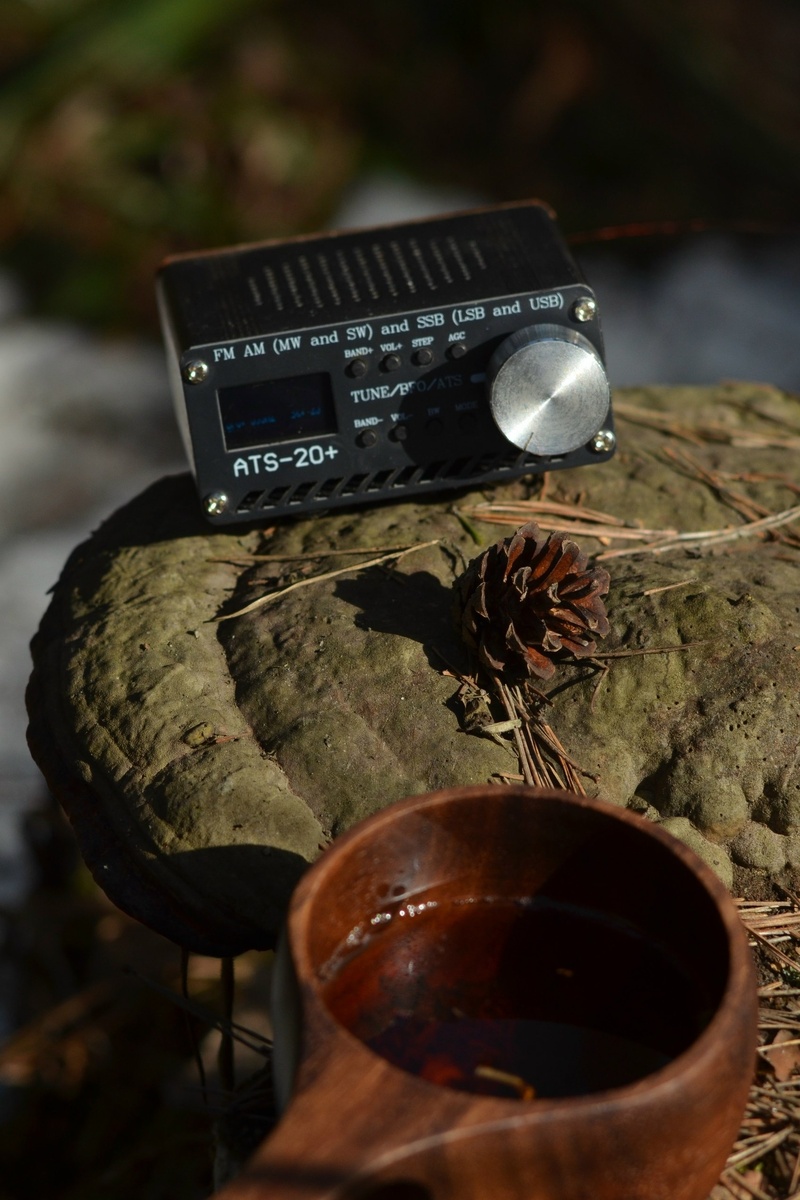 В лесу редко бывает по-настоящему тихо. Даже когда затихает ветер и замолкают птицы, лес продолжает говорить. Шорох шишек, потрескивание коры, дыхание мха — всё это есть, если слушать. Но иногда можно включить другой слух. Старый пень, поросший трутовиком, принял маленький приёмник ATS-20+. Рядом — таёжная кружка, из которой поднимается пар. Две молодые шишки лежат рядом с раскрытой, и кажется, что они тоже прислушиваются. В лесу нет городских помех. Здесь эфир чист. Короткие волны приходят из-за горизонта: голоса, морзянка, цифровые сигналы, похожие на космические шумы. В этом хаосе есть порядок, который улавливает только терпеливый слух. Никто не знает, что поймаешь сегодня. Может быть, радиолюбителя из Сибири, который рассказывает о погоде. Может быть, далёкую станцию, голос которой едва пробивается сквозь треск. А может быть, просто шум, в котором угадывается дыхание планеты. Это не радиосвязь в привычном смысле. Это способ почувствовать, как мир устроен на самом деле. Сигналы,