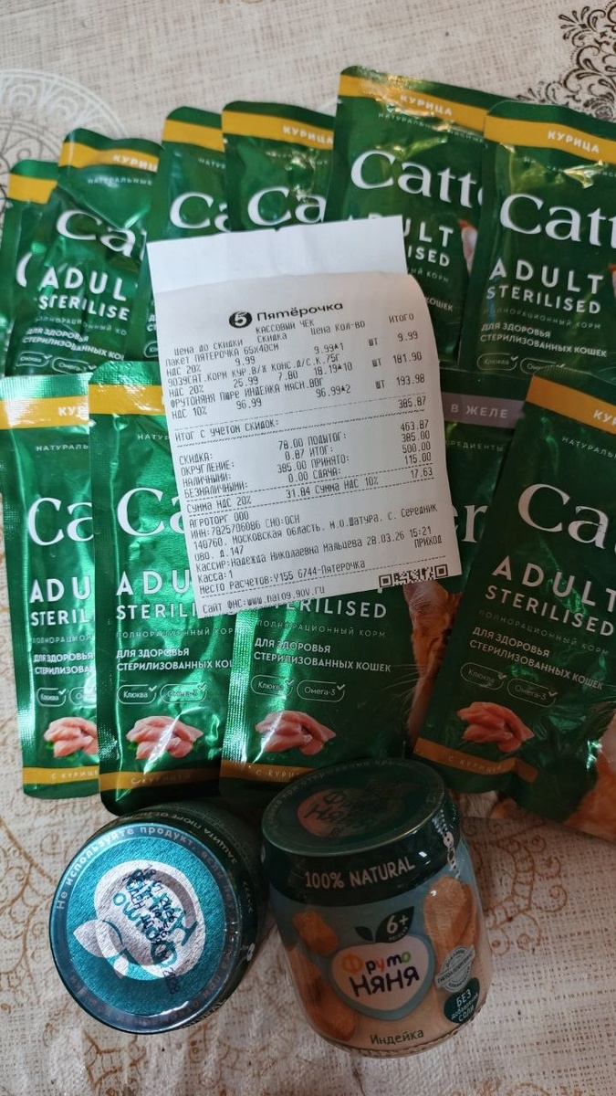 Куплено хвостикам пакетики влажного и две баночки мясного больной малышки на 380р