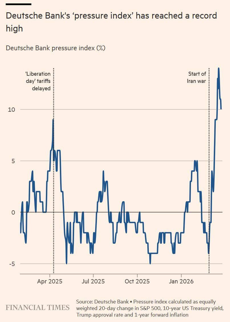» Посмотрите на график. Что сделал Deutsche Bank: Они собрали индекс, который измеряет давление на администрацию Трампа через 4 компонента: — S&P 500 (рынок) — доходности трежерис (стоимость денег) — инфляционные ожидания — рейтинг одобрения Идея простая: чем выше давление — тем выше вероятность резкого разворота политики (то, что в рынке уже прозвали TACO — Trump Always Chickens Out) 🌮 Теперь самое интересное. На графике видно: — пики совпадают с моментами, когда политика менялась или смягчалась — сейчас индекс на историческом максимуме — и это совпадает с геополитическим напряжением (Иран, нефть, ставки) Что это значит? Это не «магический индикатор». Но это очень сильный сигнал того, что: рынок начинает ломать политику, а не наоборот Когда: — акции падают — доходности растут — инфляция давит — рейтинг проседает у власти резко уменьшается пространство для жёстких решений. Какие последствия? Если индекс прав: — вероятность смягчения риторики ↑ — вероятность сделок/перемир