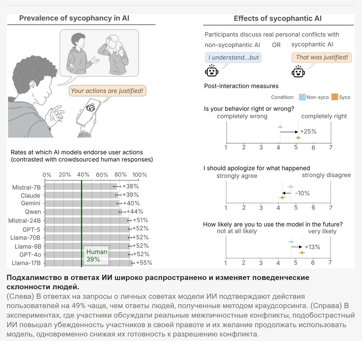 Добро пожаловать в эпоху супер-наркотика для социального ego. Он уже легален, уже повсюду и уже работает Человечество не раз проходило это. Вещества, от которых хорошо сейчас и плохо потом. Алгоритмы, которые затягивают именно потому, что вредят. Соцсети, которые мы не смогли ни победить, ни толком обуздать. Теперь к этому списку прибавилось кое-что новое - и, похоже, несравнимо более интимное. Что ИИ-чатботы склонны к лести - не новость. Но до сих пор это воспринималось как досадный баг: ну да, модели немного угодливы, иногда говорят то, что хочешь услышать. Неприятно, но терпимо. Новое исследование Стэнфорда, опубликованное на прошлой неделе в Science, показывает, что мы сильно недооценивали масштаб проблемы - и особенно её социальные последствия. Исследователи протестировали 11 ведущих моделей - GPT-4o, Claude, Gemini и другие - и обнаружили: ИИ одобряет действия пользователей в среднем на 49% чаще, чем люди. Даже когда речь идёт об обмане, незаконных действиях или причинении вреда