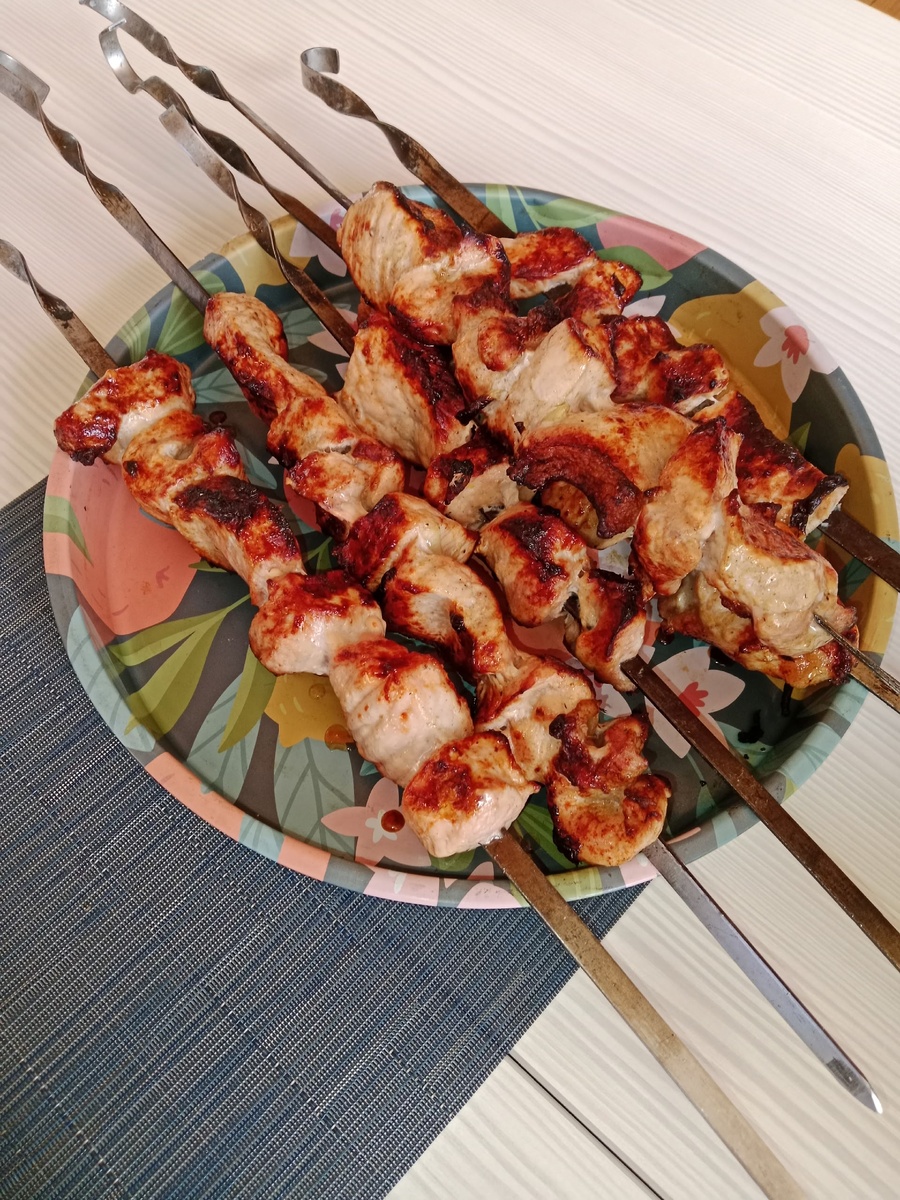 Замариновать мясо лучше с вечера и убрать в холодильник. Для этого свинину нужно нарезать на крупные куски, добавить приправу (весь пакетик) и нашинкованный лук. Жарить на шампурах. У нас в семье шашлыком занимается исключительно мой муж. А вот я не умею даже мариновать его толком