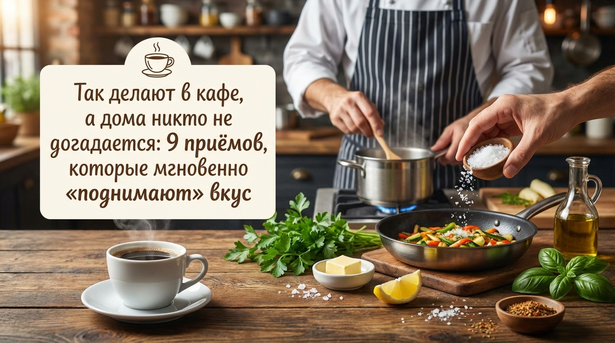 Секрет почти никогда не в «особых продуктах». Он в мелочах, которые повара делают автоматически. Ниже — 9 кафе-приёмов, которые можно повторить дома без дорогих ингредиентов. И да — гости будут уверены, что вы «заказывали доставку» 😄 Самая частая домашняя ошибка — посолить в конце. В кафе соль добавляют поэтапно: