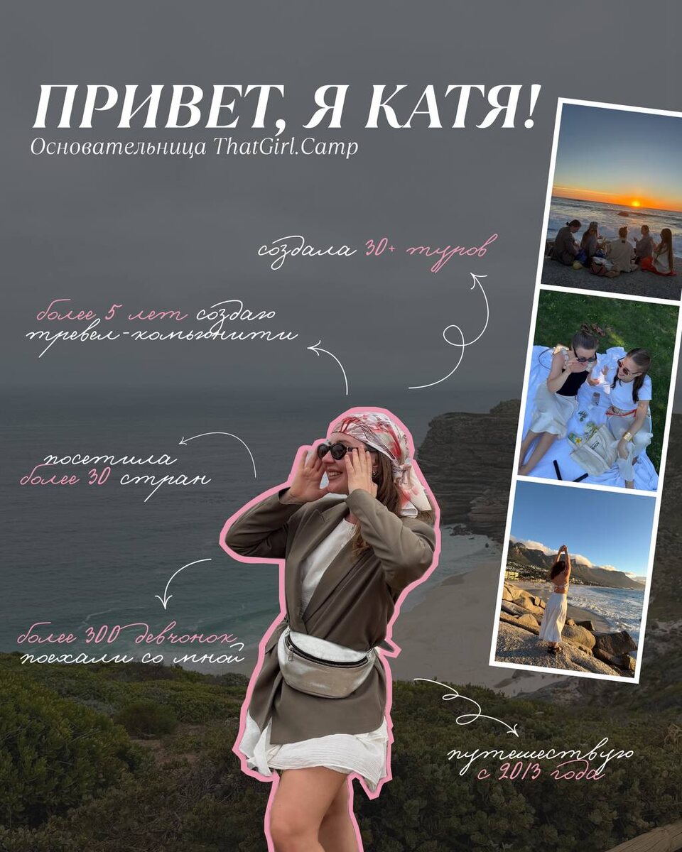 Девчонки, сегодня хочется поговорить о том, кто такой организатор тура и почему он так важен, особенно в путешествиях для девушек 🤍 Организатор - это сердце каждого тура, человек, который видит все «подводные камни» заранее и превращает обычную поездку в настоящее приключение без стресса и неприятных сюрпризов. В ThatGirl.Camp этим человеком является Катя - путешественница с опытом, основательница комьюнити и та, кому доверилось уже более сотни девушек. За её плечами более 30 стран, 30+ авторских туров, десятки историй, наполненных безопасностью, поддержкой и уникальной атмосферой. Катя - организатор, который по-настоящему влюблен в свое дело. Она позаботится о каждой детали, чтобы вы могли просто наслаждаться моментом 🫶🏻 Настоящее доверие рождается из опыта, искренности и любви к людям. Именно это вы получаете в каждом туре от ThatGirl.Camp Следи за нашими обновлениями, подписывайся на соцсети ThatGirl.Camp и выбирай путешествие, которое станет твоей личной историей! ✈️💌 Мы
