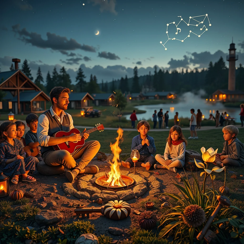 Вечером у костра Иван взял гитару и сыграл мелодию — ту самую, что когда‑то услышал вместо гула. Дети подхватили, кто‑то запел. Музыка раздалась над лагерем, над лесом, над водоёмом.
