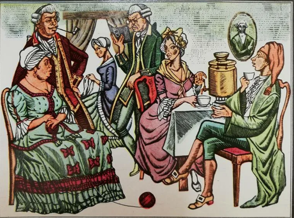 Герои ещё не сказали ни слова, а мы уже понимаем, что Сын и Советница следят за модой и одеты согласно её требованиям. Об их манерах тоже ясно сказано: «кобеняся, пьёт чай», «жеманяся, чай разливает».