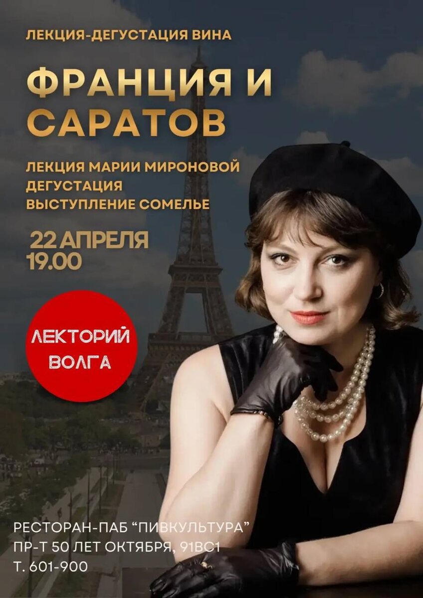 Лекторий «Волга» и Мария Миронова приглашают вас на лекцию-дегустацию вина ФРАНЦИЯ И САРАТОВ Вам кажется, что Франция и Саратов — это две параллельные вселенные? Вовсе нет... Очень даже связаны... Но история — великая насмешница. Именно здесь, разворачивались сюжеты, достойные пера Дюма. На лекции вас ждет 🍷дегустация изысканного французского вина, под рассказ профессионального сомелье. А также вы узнаете от лектора Марии Мироновой о том: 🇫🇷Как французы оказались в Саратове и чем занимались, 🇫🇷как фраза «S’il vous plaît» превратилась в саратовское «сивупля», а имена маркизов стали нарицательными для местных купцов? 🇫🇷где остались следы французского авантюризма и романтики от старых купеческих особняков, до лютеранских кладбищ и даже в названиях улиц, о которых вы и не догадывались. 🇫🇷почему французы стали востребованными медиками 🇫🇷как с Саратовом связаны "Три мушкетера" 🌳🌳🌳как создали парк и бульвар 💸Стоимость билета 1850₽, предоплата 850₽, доплата на месте 1000₽