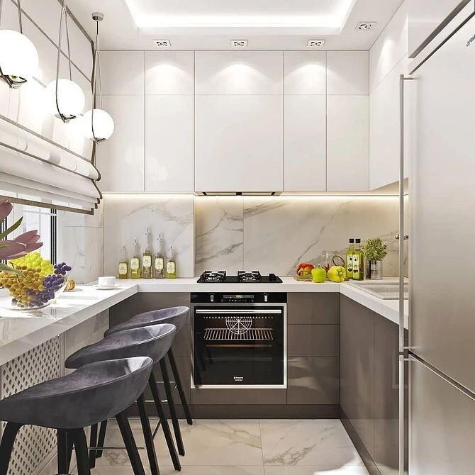 Если вы посмотрите на картинку, то заметите главную фишку, которая экономит пространство — отказ от классического обеденного стола в центре комнаты. Вместо него подоконник продлевается и превращается в стильную барную стойку. Это решение освобождает центр кухни для комфортного перемещения и готовки, а также дарит вам идеальное место для утреннего кофе с видом из окна.