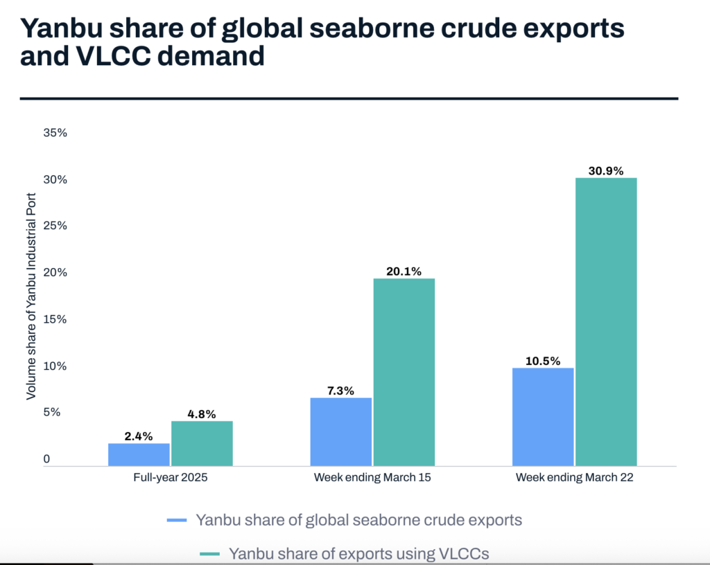 Фактическое закрытие Ормузского пролива значительно повысило значение Янбу, который получает сырье по трубопроводу «Восток-Запад» компании Saudi Aramco. На долю Янбу на прошлой неделе пришлось 11% мирового объема морских перевозок нефти по сравнению с всего 2% в 2025 году, а также 30% спроса на сверхбольшие танкеры (VLCC) по сравнению с всего 5% в прошлом году. Опасение вызывает то, что по мере усиления роли Янбу военные действия США против Ирана могут спровоцировать ответные меры, которые помешают или отпугнут операторов танкеров от транзита через Баб-эль-Мандебский пролив. Согласно данным о местоположении судов, предоставленным сервисом Seasearcher компании Lloyd’s List Intelligence , в четверг у берегов Янбу или у причалов находилось 33 сверхбольших танкера (VLCC).