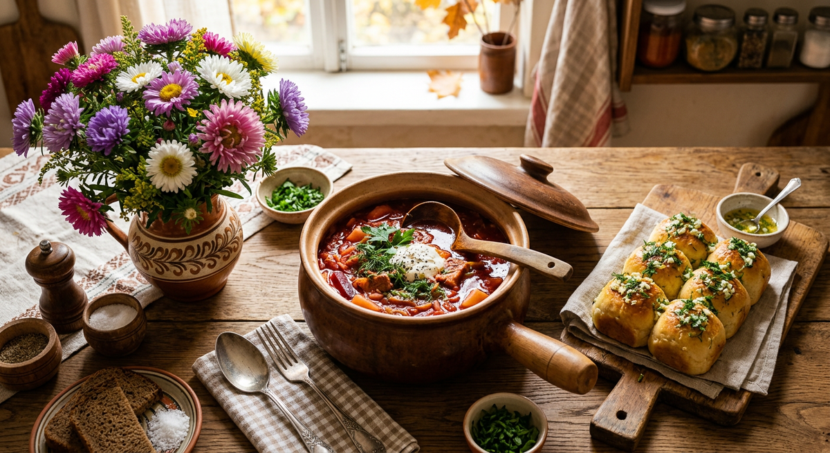 Я помню это с детства — запах, от которого просыпался весь дом. Свёкла, томат, укроп, чеснок. Мама стояла у плиты с шести утра. Тёрла свёклу вручную — комбайн не признавала, говорила, что он убивает вкус. Лепила пампушки — круглые, мягкие, с корочкой. Натирала их чесночным маслом.
