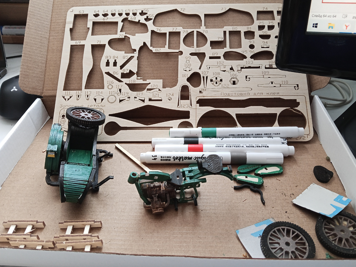 Решил я всё-таки попробовать раскрасить собираемые модели. В качестве образца выбрал первый собираемый мотоцикл. Он в масштабе 1:18, но всё равно достаточно небольшой. Думаю, ну испорчу - не велика потеря. Сразу понимал, что делать это (красить детали) нужно в процесс сборки. По окончании вообще нереально. Полазив по разным форумам решил, что начать можно с акриловых маркеров. У жены таких оказался целый набор. Выбрал нужные цвета и... Короче это убиться ) Времени уходит раз в пять больше. Нужно же покрасить, дать просохнуть, потом ничего не перепутать. А в большинстве случаев приходится подкрашивать по второму разу. И какая бы хорошая укрываемость не была у акрила, всё равно не очень получилось. Дерево - оно и есть дерево, даже в виде фанеры. Структура проступает, впитываемость неравномерная. Вот так этот процесс выглядел в процесс сборки. Лучше всего получились колеса. Вот тут я прямо доволен. А вот основной корпус - не очень. Конечно, я завтра еще подмажу те места, которые одноз