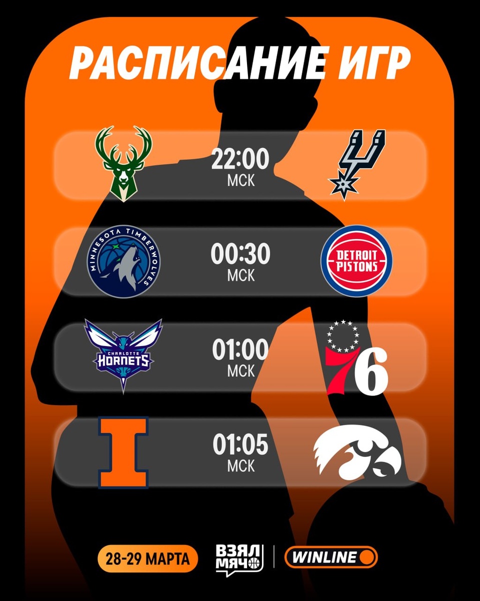 ! Нас ждёт продолжение Мартовского Безумия, а также топовая битва между «Миннесотой» и «Детройтом» с комментариями Димы Матеранского. Трансляции абсолютно всех игр смотрите в нашей группе ВК 👈🏼 22:00 | Милуоки — Сан-Антонио 🎙 Сергей Абаев 00:30 | Миннесота — Детройт 🎙 Дмитрий Матеранский 01:00 | Шарлотт — Филадельфия 🎙 Георгий Гигинеишвили 01:05 | Иллинойс — Айова 🎙 Дмитрий Хамидулин 02:30 | Атланта — Сакраменто 🎙 Андрей Протасов 03:00 | Мемфис — Чикаго 🎙 Павел Воронин 03:45 | Аризона — Пердью 🎙 Дмитрий Хамидулин 05:00 | Финикс — Юта 🎙 Матвей Юдкин Какие игры выберете к просмотру? 🏀 ПОДПИШИСЬ — ЗДЕСЬ ЖИВЁТ БАСКЕТБОЛ!