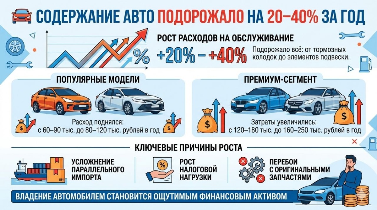 % За год расходы на обслуживание автомобилей в России выросли на 20–40% — дорожает всё: от тормозных колодок до элементов подвески. Обслуживание популярных моделей вроде Kia Rio и Toyota Camry поднялось с 60–90 тыс. до 80–120 тыс. рублей. В премиум-сегменте же рост куда более ощутимее: у BMW 3 Series и Mercedes-Benz C-Class затраты увеличились с 120–180 тысяч до 160-250 тысяч рублей только в год. Ключевые причины — усложнение параллельного импорта, рост налоговой нагрузки и перебои с оригинальными запчастями. В результате владение автомобилем всё заметнее смещается из категории «повседневной необходимости» в управляемый, но ощутимый финансовый актив. Распространение материалов допускается только с указанием ссылки на источник. 🤩 PRO: история продолжается.