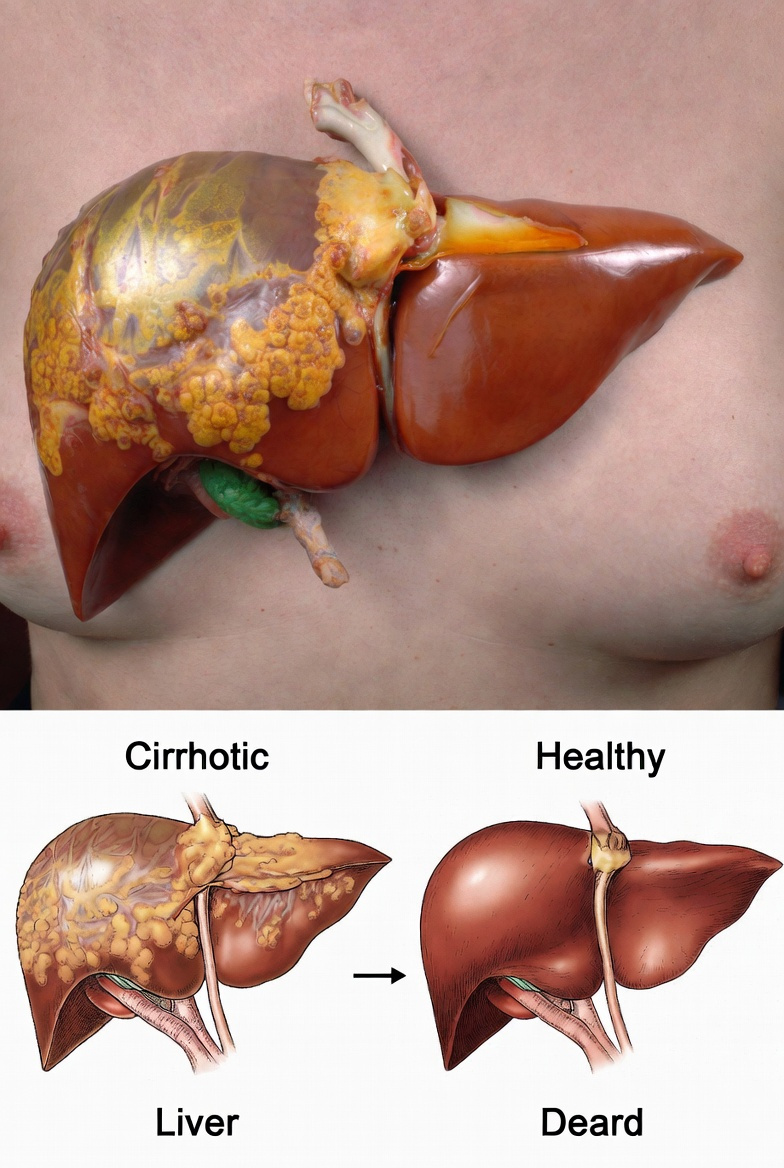 · Что происходит в организме: В печени начинается фиброз — образование грубой соединительной ткани. Клетки гибнут массово. Печень становится бугристой, увеличивается.