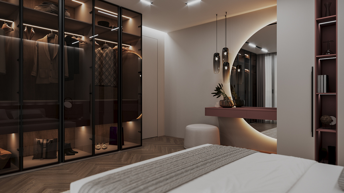 Спальня — это пространство, где каждая деталь влияет на уют и комфорт. Когда мебель разрознена, интерьер кажется набором отдельных предметов. Когда элементы связаны — появляется целостность. Показываем проект современной светлой спальни, где все предметы мебели объединены в единую композицию. От туалетного столика у входа до прикроватной тумбы — все связано в непрерывную линию. Нет разрывов, нет визуального шума. Подвесная конструкция, полукруглое зеркало со светодиодной лентой, выдвижные ящики. Мягкий свет без теней, удобство утром и вечером. Черный профиль с тонированным стеклом не перегружает пространство. Подсветка всех секций — быстрый поиск вещей без включения основного света. 4. Стеновая панель за изголовьем Древесная панель Дуб Денвер трюфель связывает обе прикроватные тумбы. Создает уютную нишу для сна, добавляет теплоты светлому интерьеру. Все элементы выполнены в единой системе. Нет случайных цветов, нет конфликтующих фактур. Каждый предмет мебели поддерживает общую идею — с