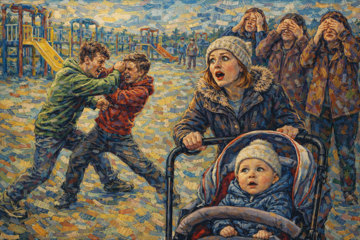 Сегодня я на детской площадке разняла дерущихся подростков, и если честно, больше всего меня выбесило даже не то, что они дрались, а то, что вокруг стояли взрослые люди, которые с поразительным упорством делали вид, что ничего не происходит, словно это абсолютно нормальная часть городской среды — когда дети бьют друг друга кулаками и пинают, а ты сидишь на лавочке и старательно отворачиваешься, будто перед тобой не реальность, а какой-то фон, который можно просто не замечать.