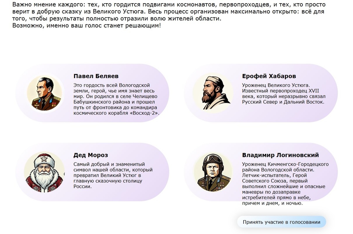 🤔Дедушка соперничает с космонавтом Беляевым и первопроходцем Хабаровым. Аэропортам Вологды и Великого Устюга предлагают голосованием присвоить имена земляков, которые связаны с авиацией, космонавтикой и путешествиями. Странно, но и Деду Морозу среди них нашлось место. Для аэропорта Великого Устюга предлагаются имена: 🚀 летчика-космонавта Павла Беляева, ⛰ первопроходца Ерофея Хабарова, ✈️ пилота Владимира Логиновского, ииииии... 🎅🏻 великоустюгского Деда Мороза! В Вологде обошлось без сказочных персонажей. Там претенденты – пионер авиации Александр Можайский, летчик-истребитель Александр Клубов, авиаконструктор Сергей Ильюшин и ас авиации Игорь Каберов. Скрины: сайт «Горжусь Вологодчиной» Речь ВКонтакте | Речь в МАКС | Речь в ОК | Речь в Дзене | 35MEDIA в МАКС
