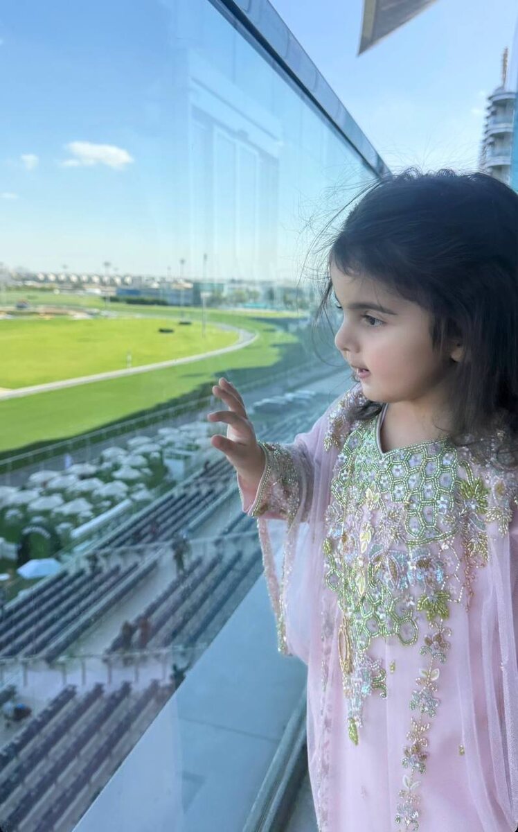 Ничего милее вы сегодня не увидите: внучка правителя Дубая шейха Махра (названная в честь мамы Махры) наблюдает за происходящим на ипподроме