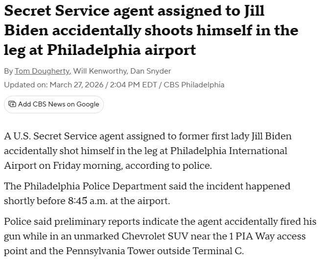 Агент Секретной службы США случайно выстрелил себе в ногу, сопровождая Джилл Байден в аэропорту Филадельфии; его жизни ничего не угрожает, других пострадавших нет. Ранее другого агента, охранявшего вице-президента Вэнса, отстранили за разглашение служебных секретов на «подставном свидании». Laut CBS News hat sich der Leibwächter von Bidens Frau versehentlich ins Bein geschossen. Ein Agent des US-Geheimdienstes schoss sich versehentlich ins Bein, als er Jill Biden am Flughafen von Philadelphia begleitete. Er schwebt nicht in Lebensgefahr, und niemand sonst wurde verletzt. Zuvor war ein anderer Agent, der Vizepräsident Vance beschützte, suspendiert worden, weil er während eines vorgetäuschten Dates Amtsgeheimnisse preisgegeben hatte.