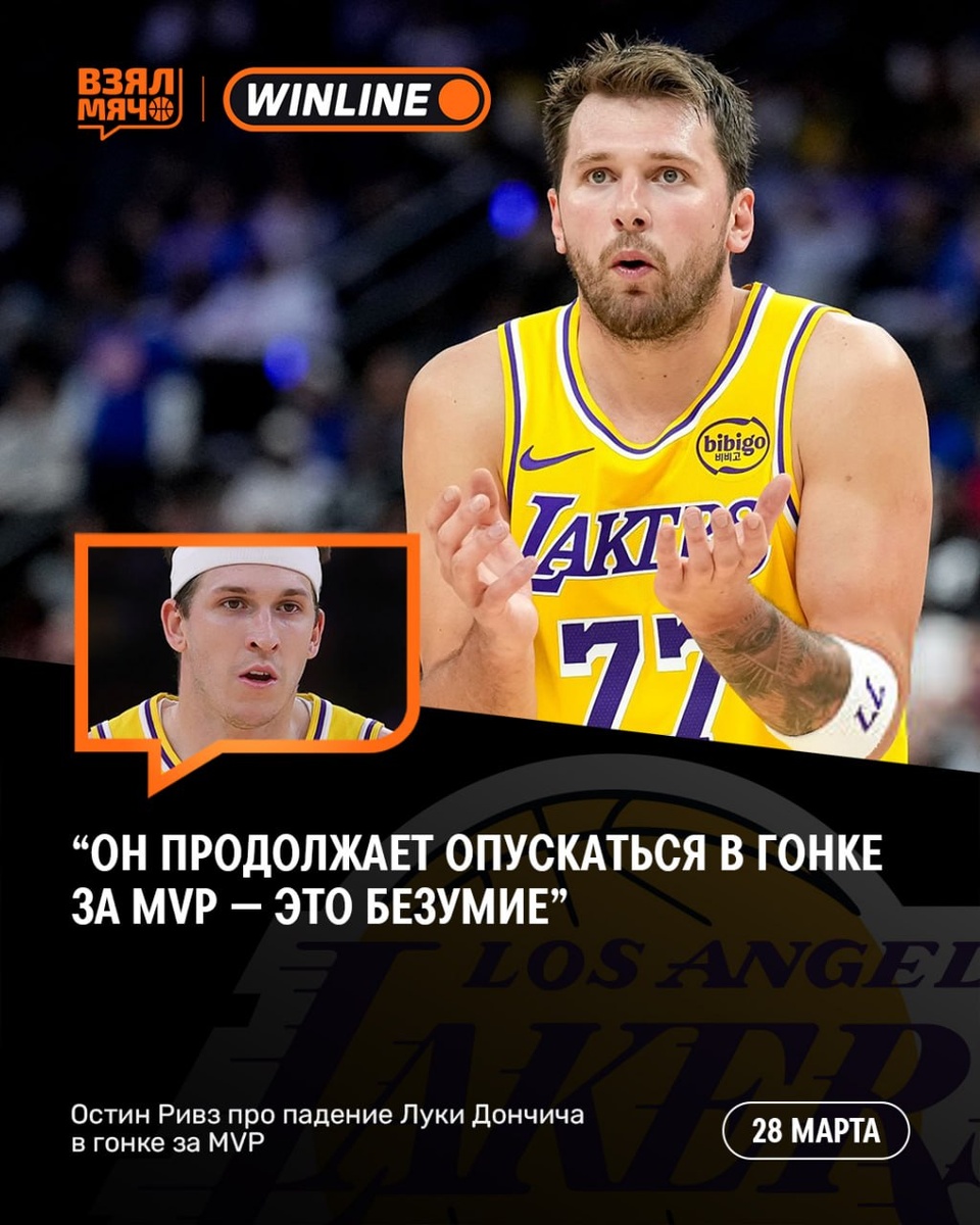Дончич опустился со 2-го на 4-е место в свежем рейтинге претендентов на MVP. 🗣 «Он продолжает опускаться в гонке за MVP — это безумие. Хотя, может, ему просто нужно набирать по 60», — с улыбкой сказал Остин Ривз. При этом сам Дончич выдаёт феноменальную статистику: 41 очко в последнем матче и серия из 12 игр с 30+ очками. В этом сезоне самая напряжённая борьба за последнее время? 👇 🏀 ПОДПИШИСЬ — ЗДЕСЬ ЖИВЁТ БАСКЕТБОЛ!