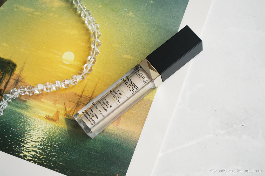 Многообещающий консилер. В консилерах я нуждаюсь гораздо больше, чем в тональных основах. Последние я сейчас использую крайне редко, а вот консилер всегда присутствует в моём макияже. Однако делать обзоры на этот тип продукта — та ещё задача. Не люблю я это дело, слишком сложно мне и моему фотоаппарату уловить ту самую разницу, которую все так хотят увидеть на своём лице. Но раз этот обзор вышел, значит, что-то показательное здесь всё-таки есть. Консилер Eveline Wonder Match 005 Light Porcelain Особо расписывать дизайн продукта я не буду, всё видно на фотографиях, добавлю лишь то, что выглядит он явно дороже своей цены. Оформление на стиле, к тому же из качественных материалов. Объём — 6,8 мл. В описании упоминается волшебный состав продукта: гиалуроновая кислота, термальная вода и даже амазонская глина. Это точно декоративный продукт? Мне лично напоминает состав какой-нибудь маски для лица. Я выбрала самый светлый оттенок — 005 Light Porcelain. Не изменяю своим принципам, всегда выбир
