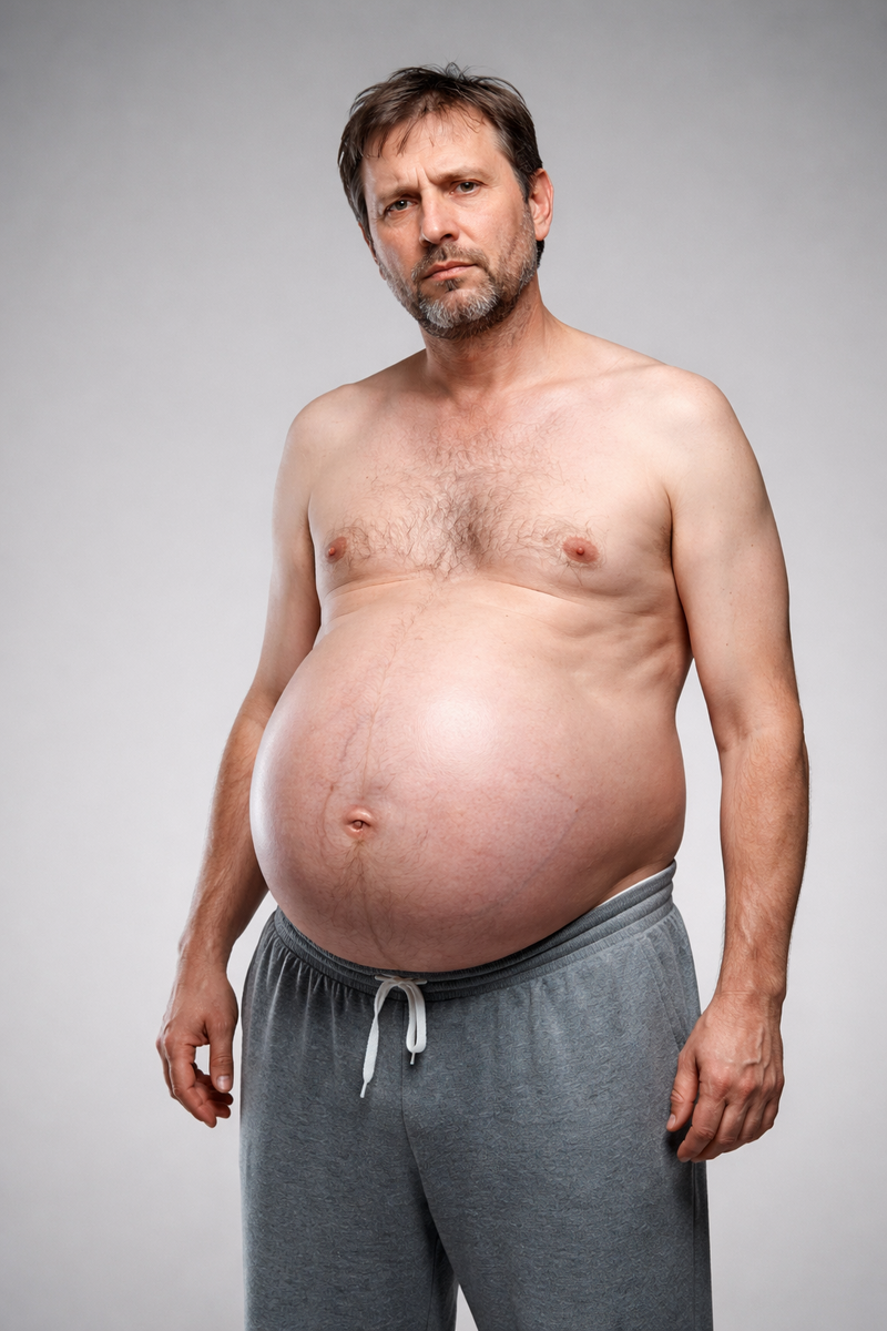 Это начальный этап, когда живот растет не из-за жидкости, а из-за висцерального жира, который откладывается вокруг внутренних органов.