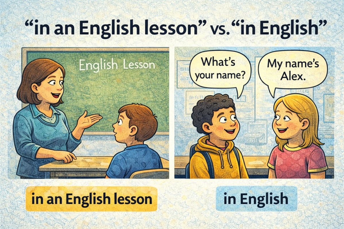 Путаетесь в “на английском” и “на уроке английского”? Нормально. Но в английском для этого ОДИНАКОВЫЕ предлоги. 1) “На уроке английского” Правильно: in an English lesson / in English class I didn’t understand it in English class. We practised speaking in an English lesson today. Единственная загвоздка - это артикль: In an English lesson Здесь используется неопределенный артикль "an", потому что речь идет о каком-то конкретном, отдельном уроке английского языка. Артикль "an" подчеркивает, что это один урок из многих возможных: In English class Здесь артикль отсутствует (нулевой артикль), и выражение "English class" воспринимается как общее понятие, вид деятельности или учебный предмет. Это устойчивое выражение, которое описывает процесс или место обучения в целом 2) “На английском языке” Правильно: in English Can you say it in English? This word means… in English. 3) Но если вы используете глагол speak, то после него предлог не ставится, и поэтому фраза “На английском уроке мы го