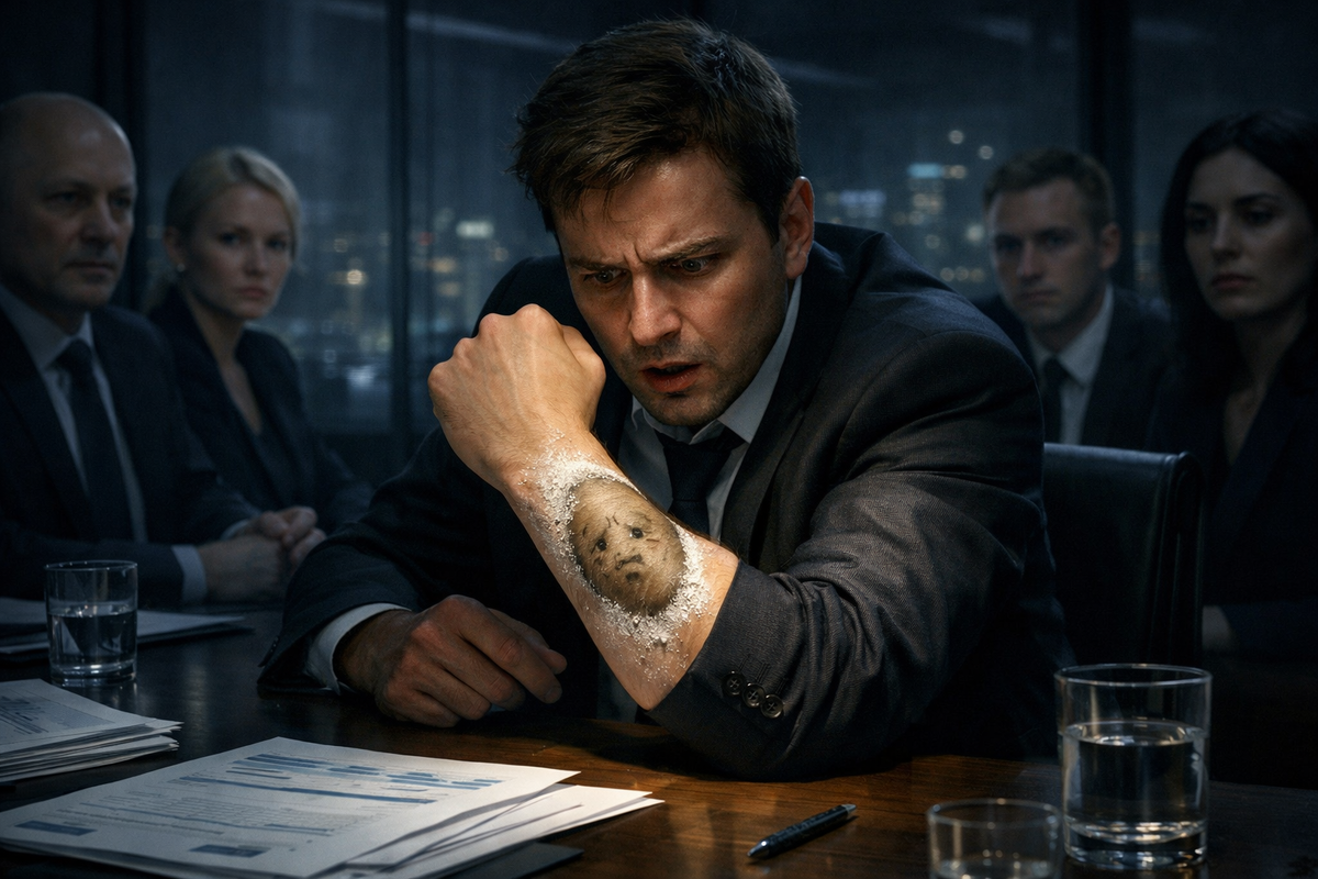 У Петра была татуировка с изображением картошки. Это была очень неплохая картошка, но ночью забавная картошка становилась печальной и одинокой. Работодатели не любили татуировку Петра. Почему, ему было неизвестно. Скорее всего, их расстраивала превращающаяся ночью картошка. Ношение татуировки не всегда оказывалась простым делом. Было понятно, что картошка в Петре замешана. Из-за нее он несколько раз лишился работы. Однажды Петр решил покрыть татуировку косметическим средством. Все день он радовался своей удаче, но ночью средство стало растворяться, и грустная картошка вновь появилась на его руке. Петр огорчился, но продолжал искать работу с картошкой и без. Ночью грустная картошка превращалась в смех, этот абсурд ему даже начал нравиться. Однажды Петр услышал о вакансии в банке. Ему сказали, что он отлично подходит, но должен скрыть татуировку. Поэтому Петр снова взял пудру и покрыл картошку. Всех в банке заставила улыбнуться его непревзойденная способность общаться с клиентами. Вскоре